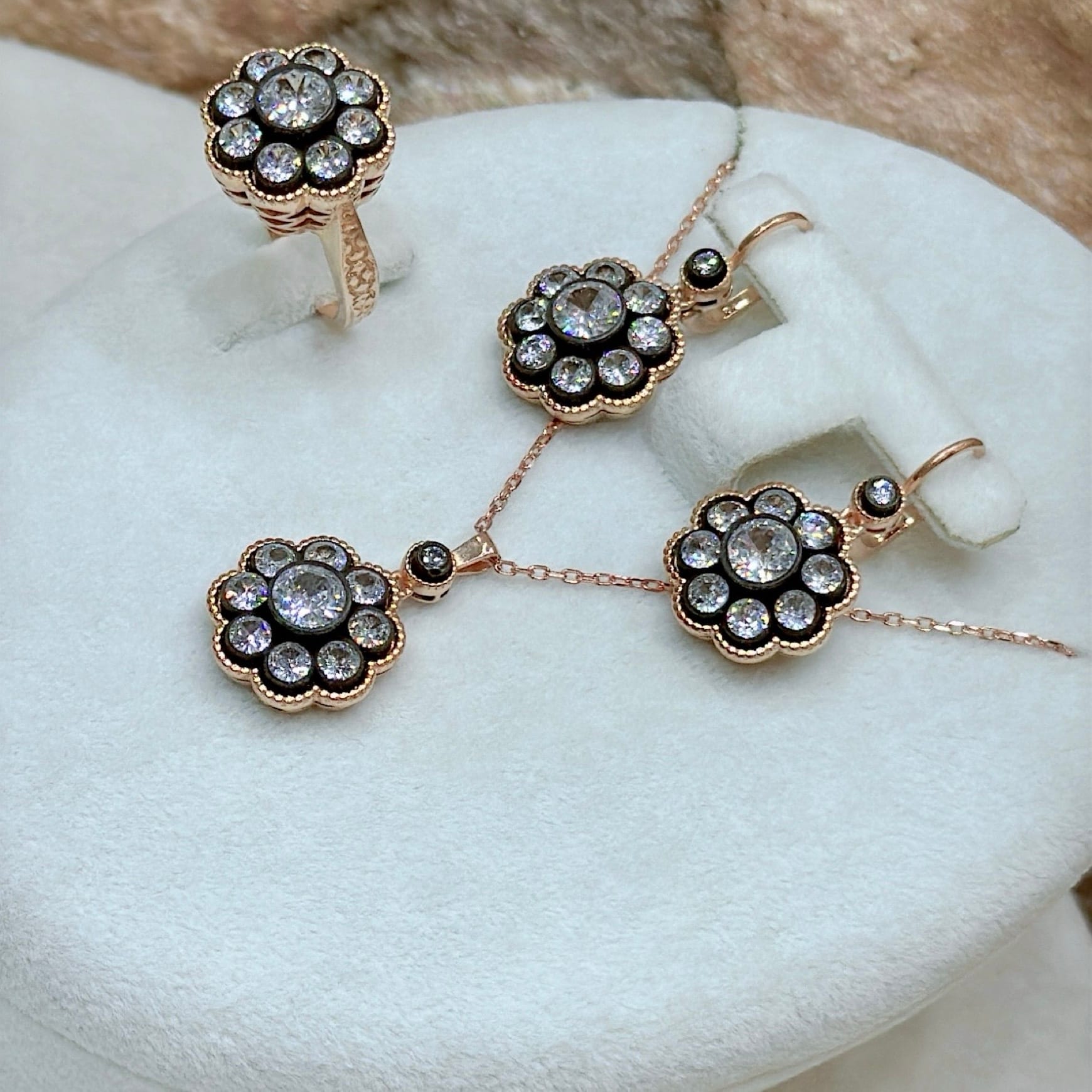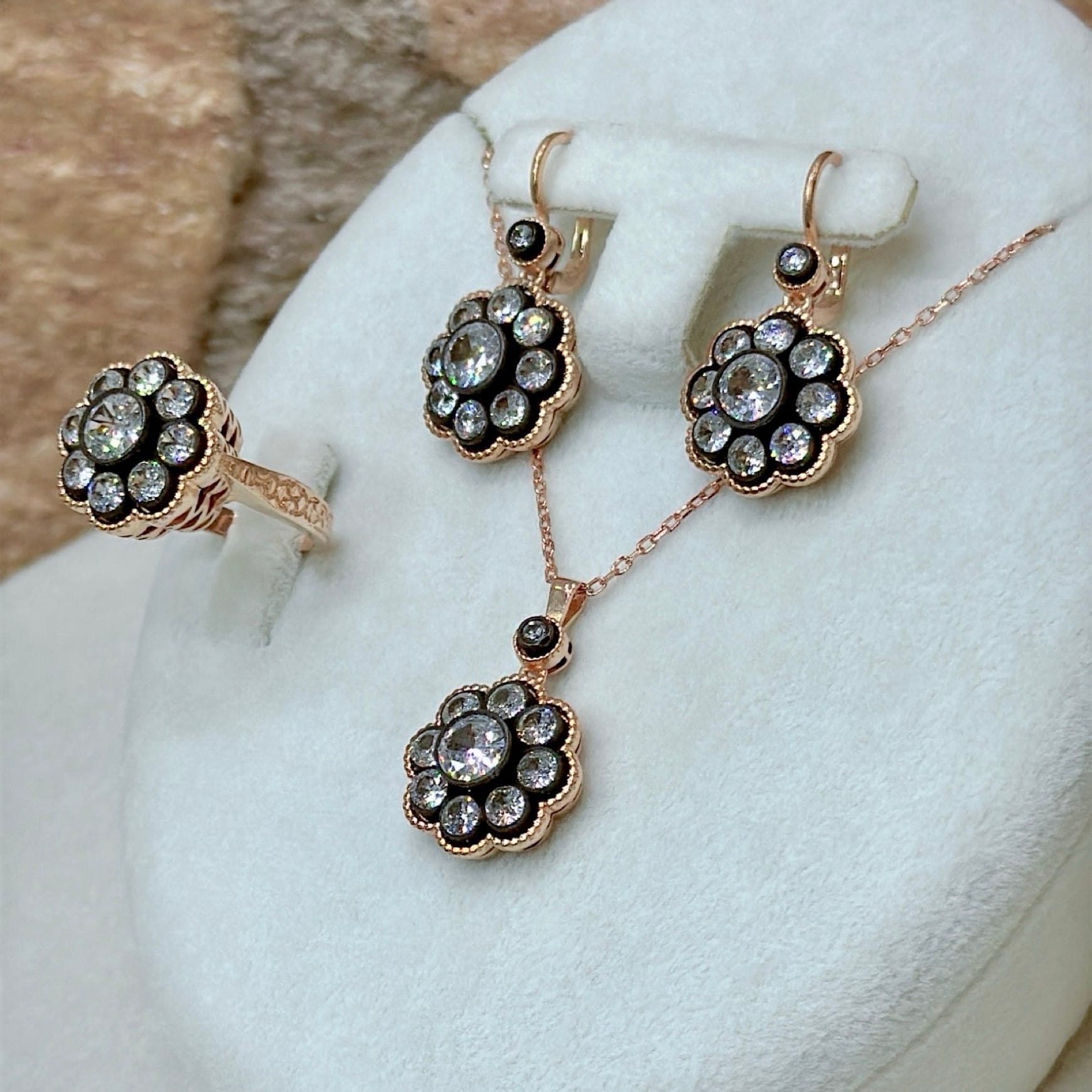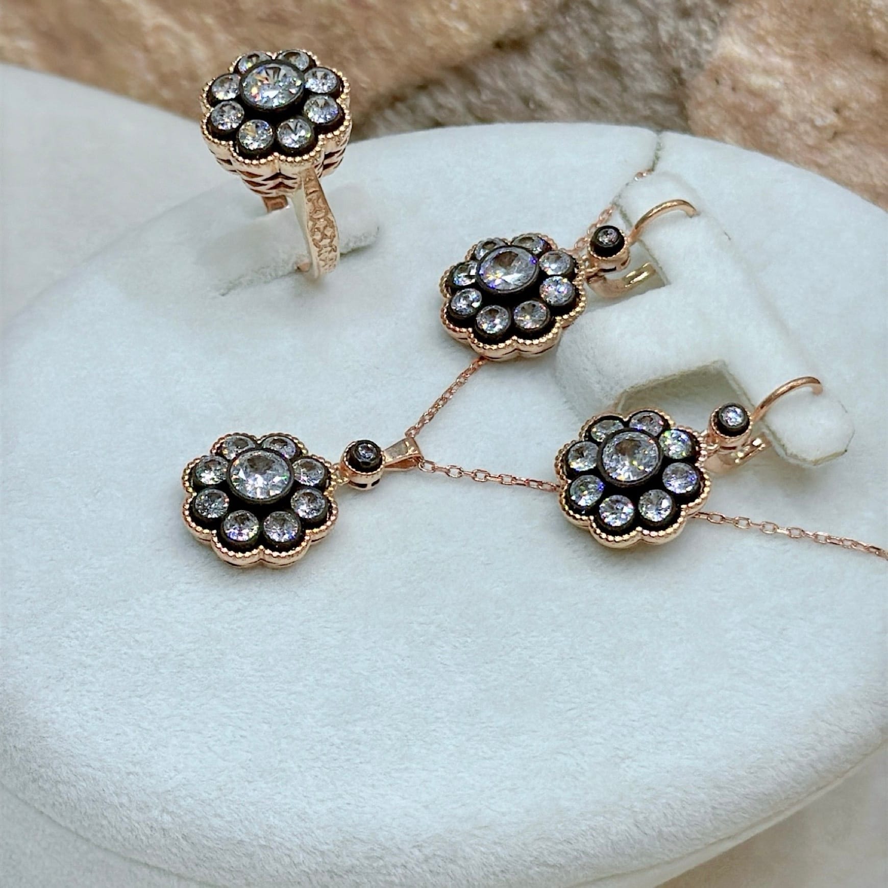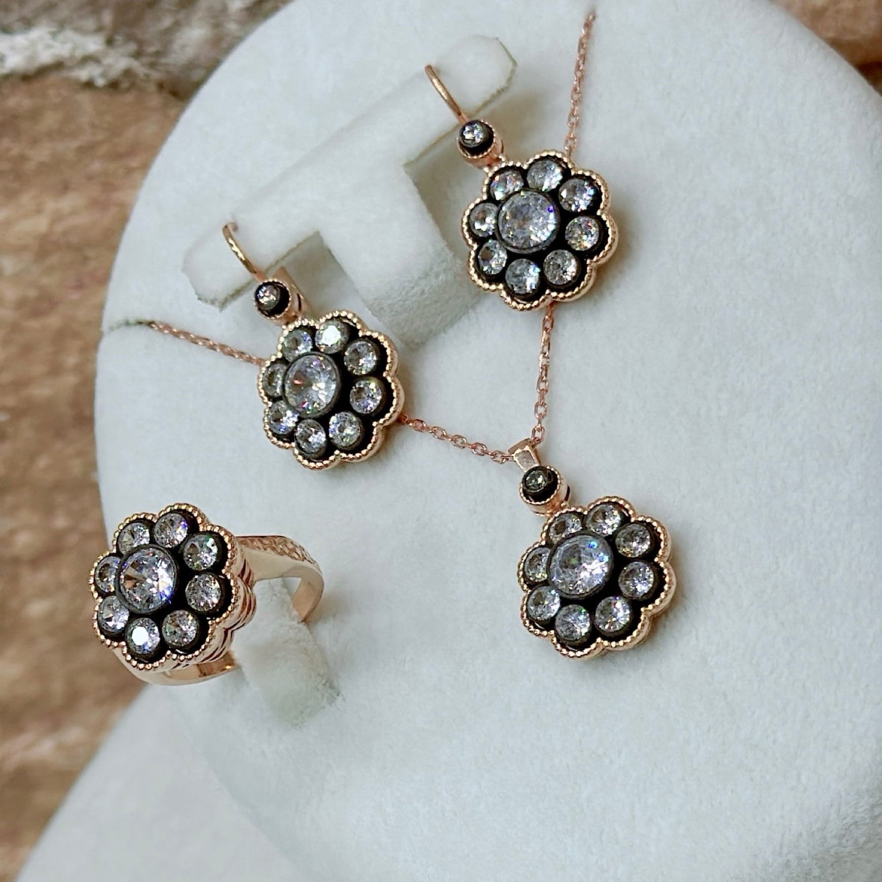 Çiçek Model Zirkon Taşlı Üçlü Set