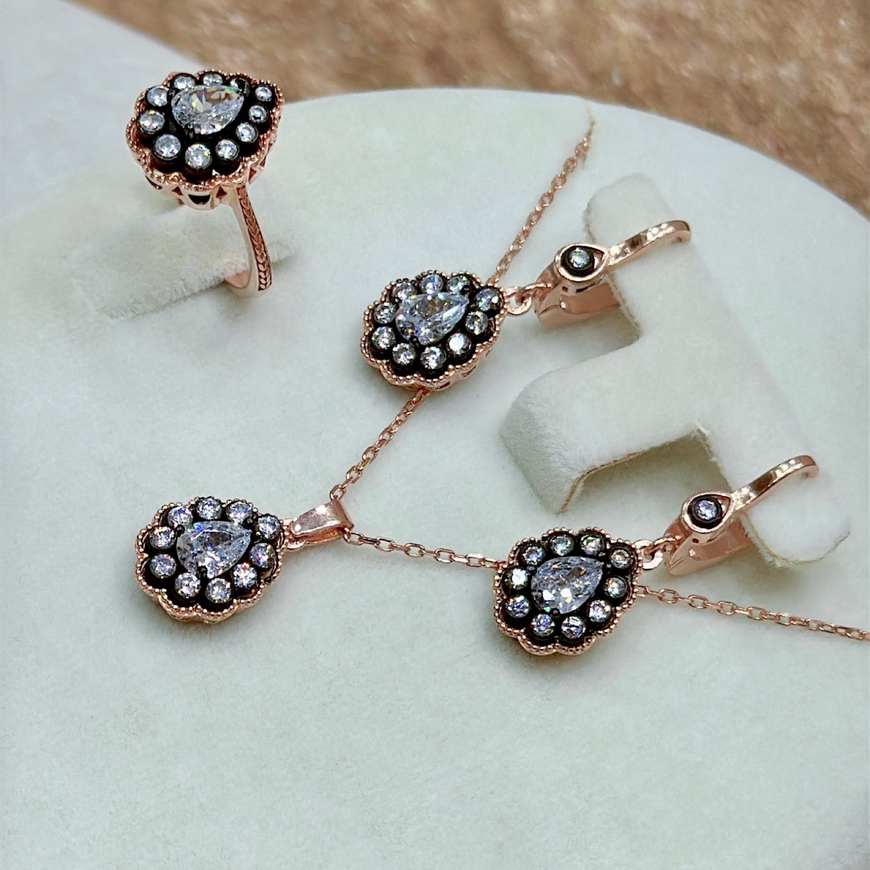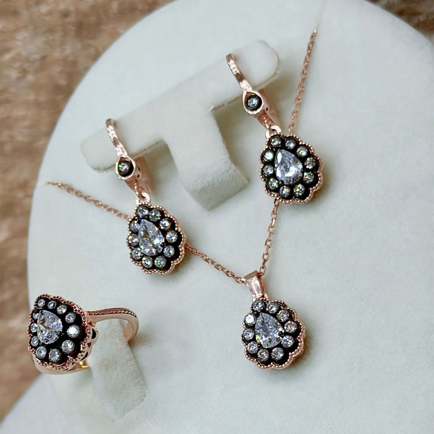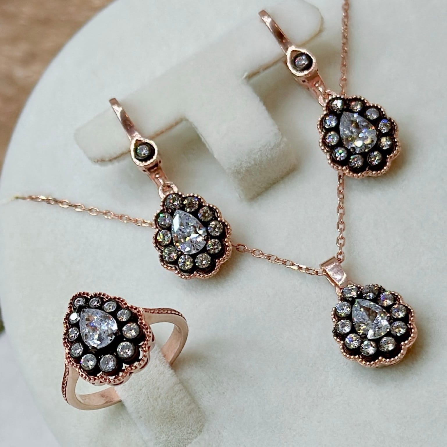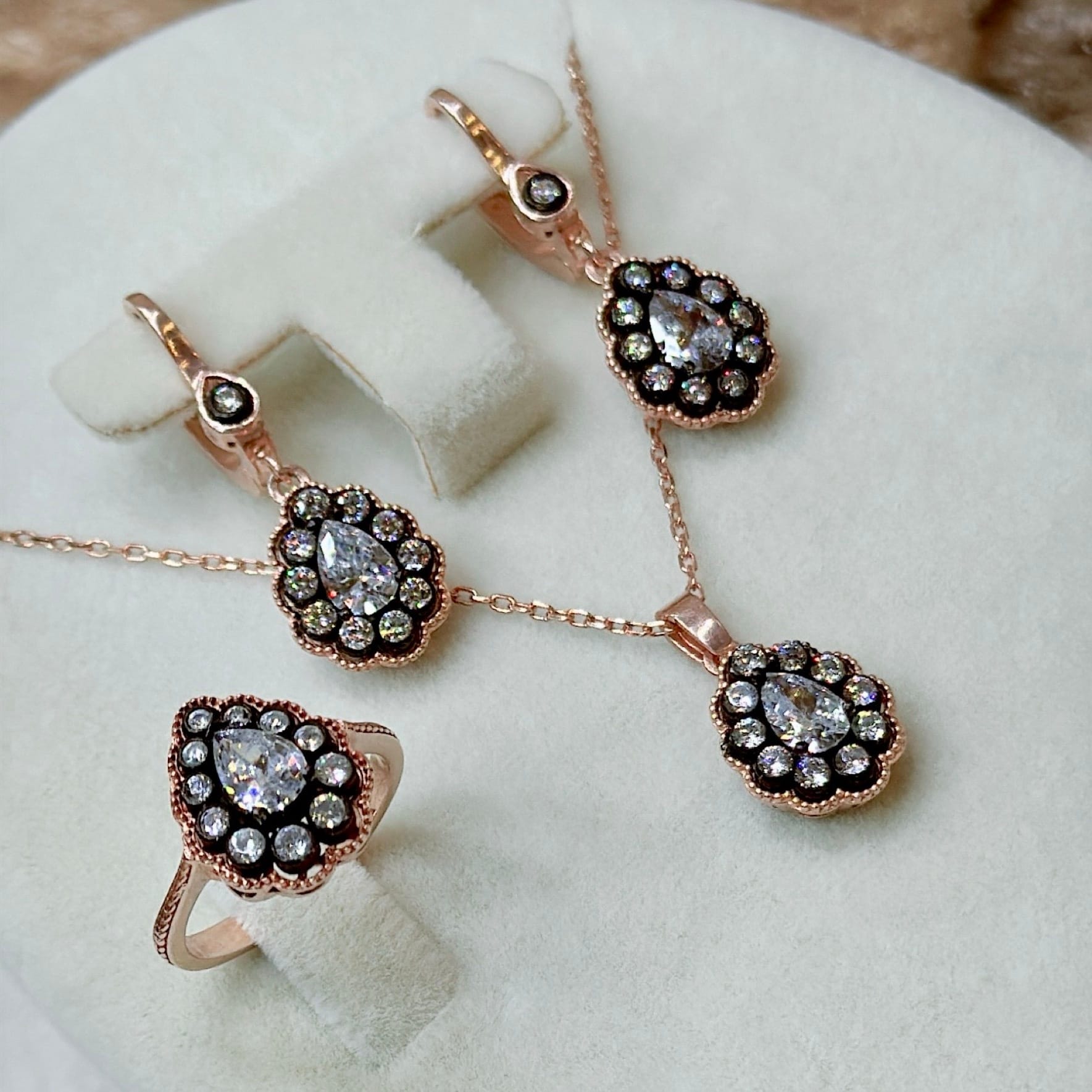 Elmas Montür Damla Rosegold Gümüş Üçlü Set