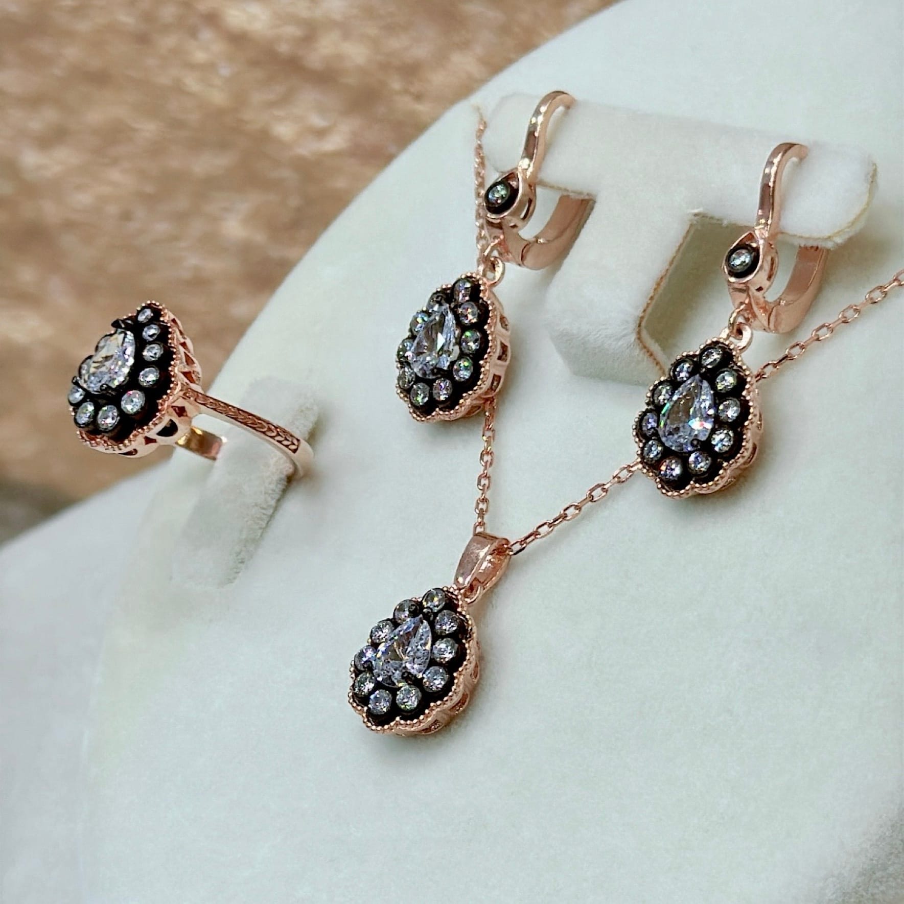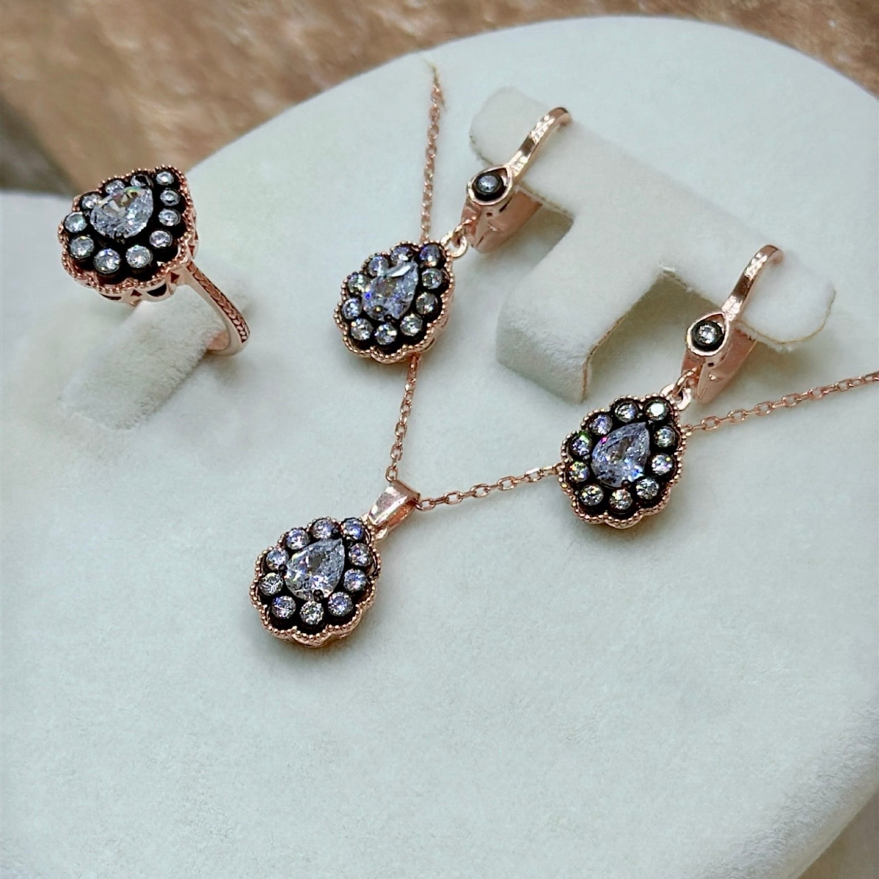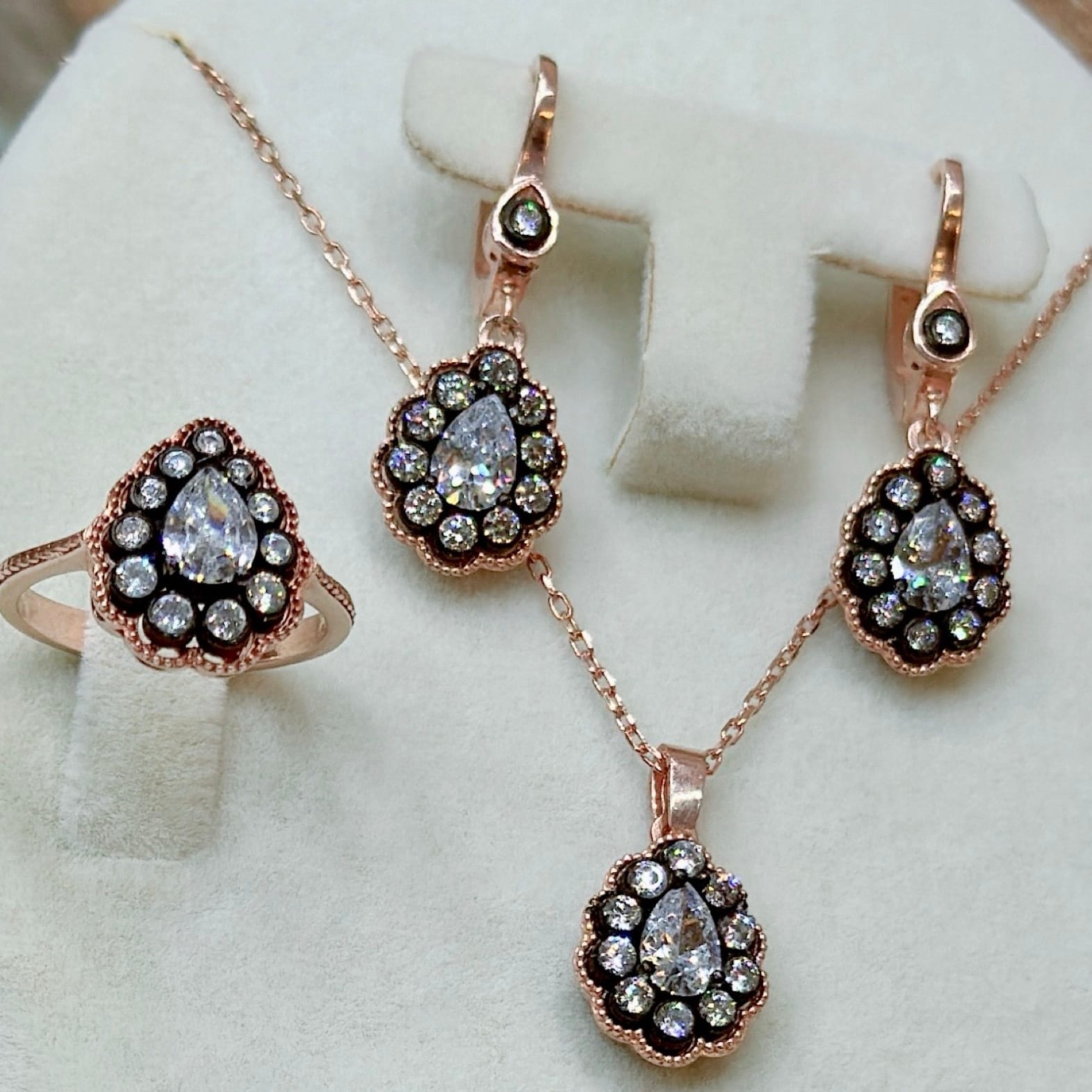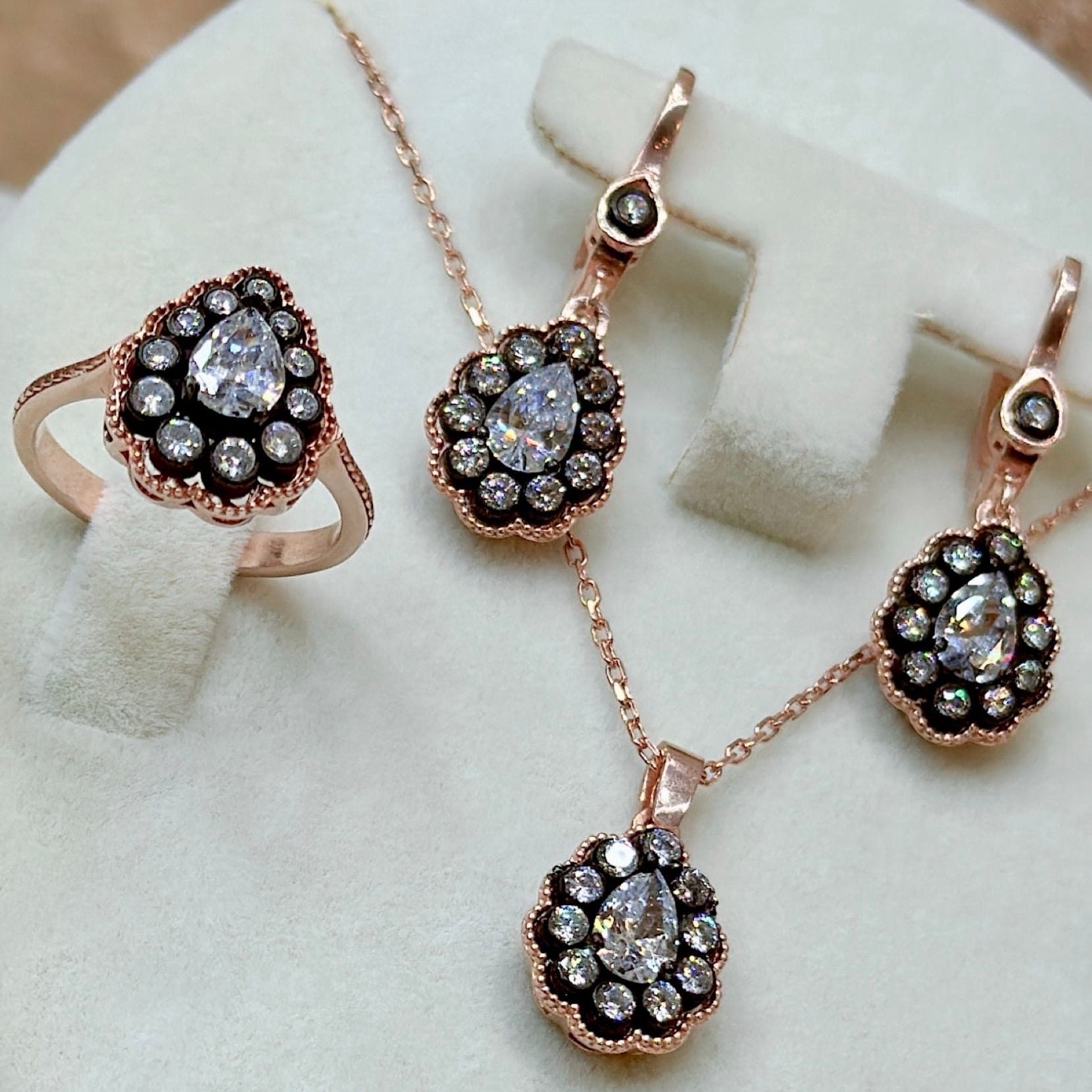 Elmas Montür Damla Rosegold Gümüş Üçlü Set