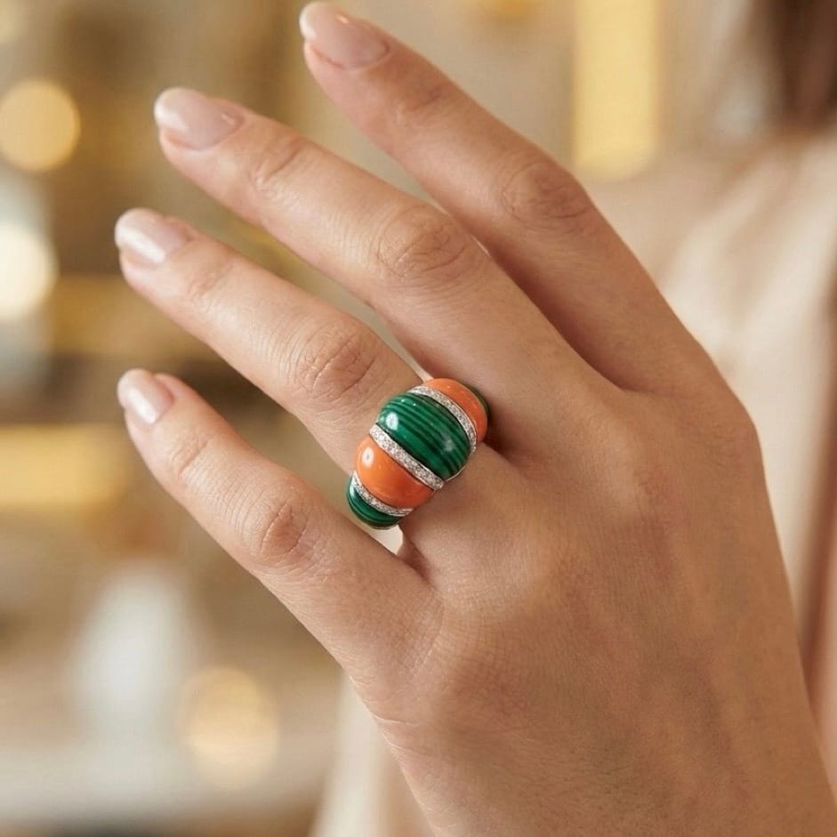 *Opal Mercan & Yeşil Sedef Taşlı Gümüş Yüzük
