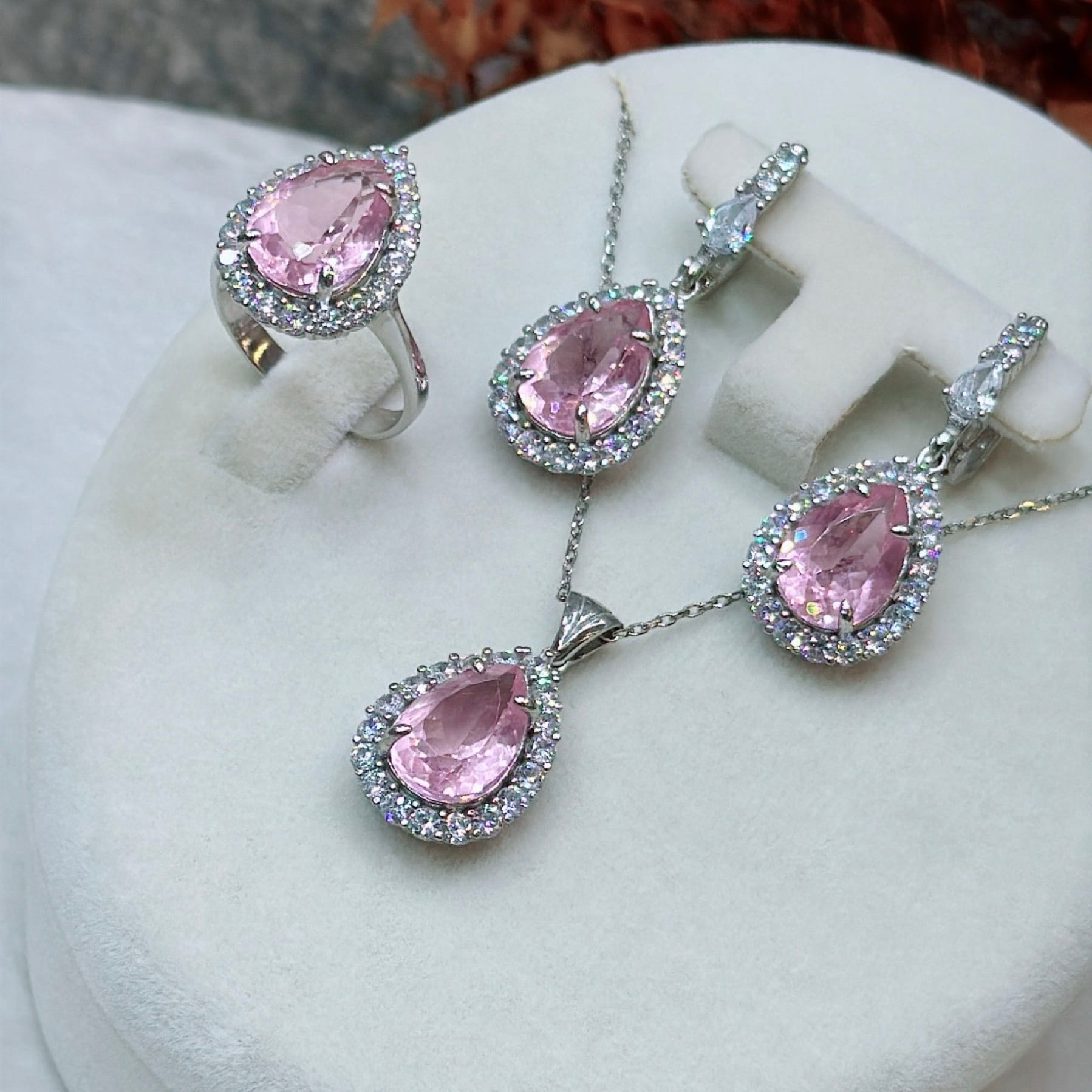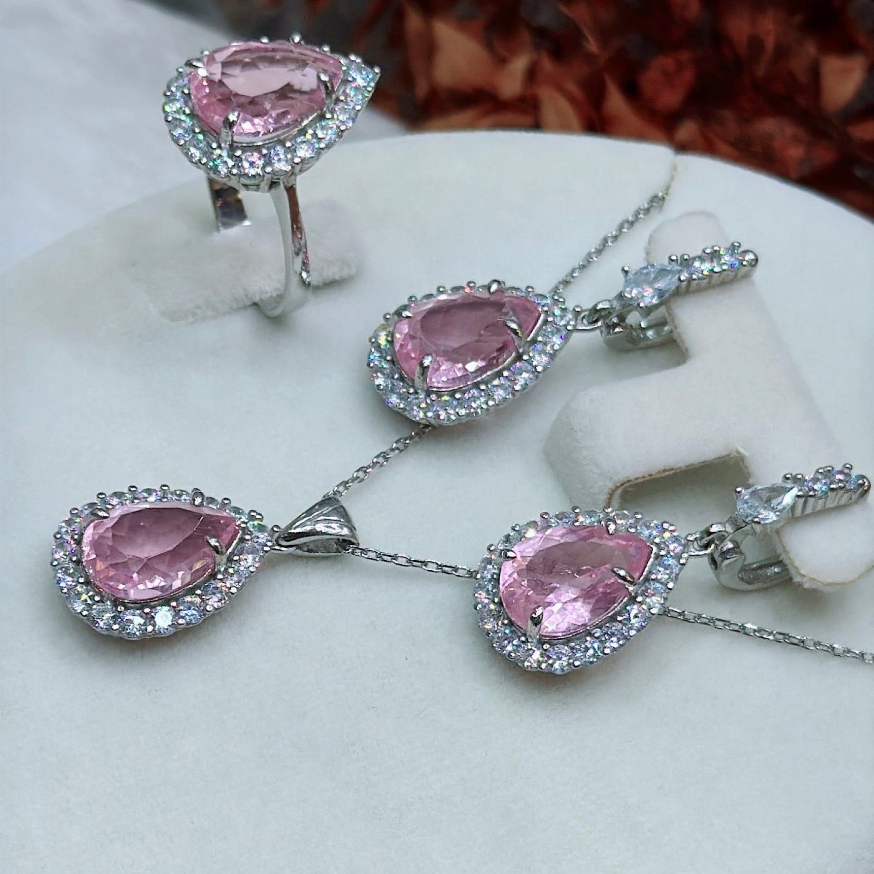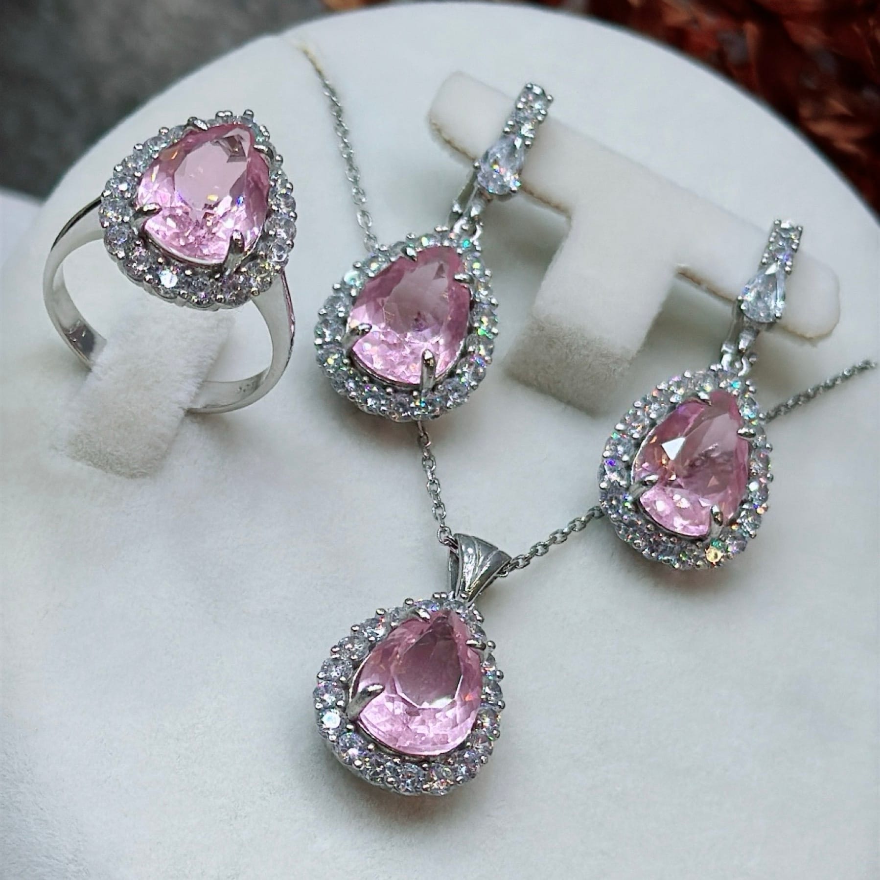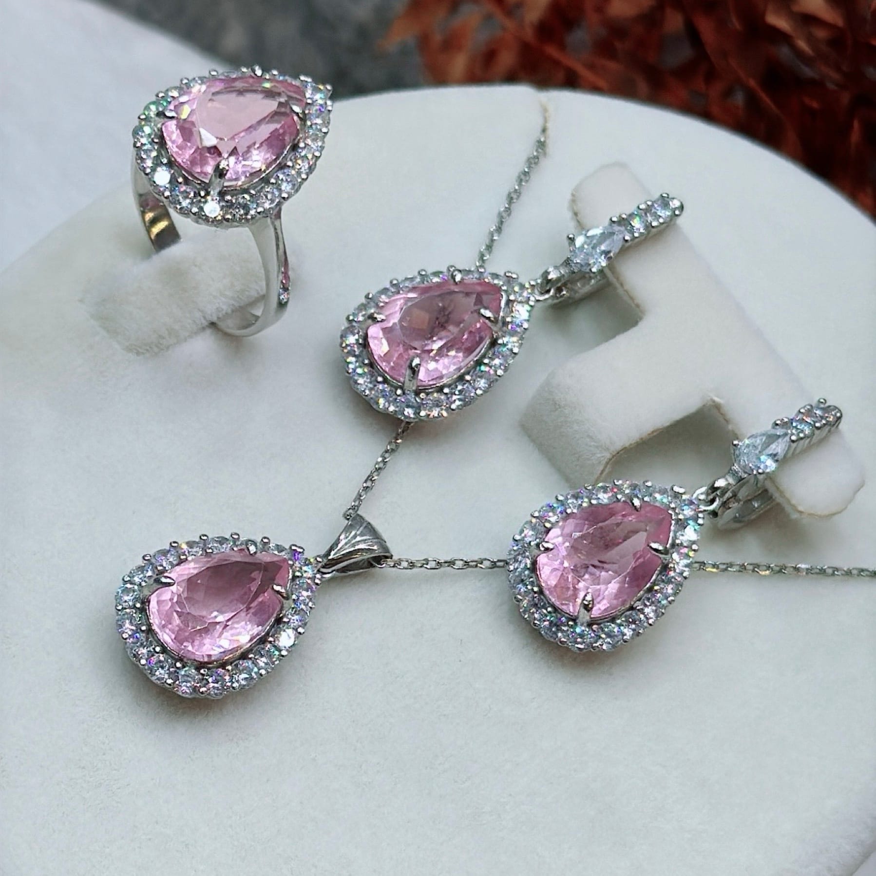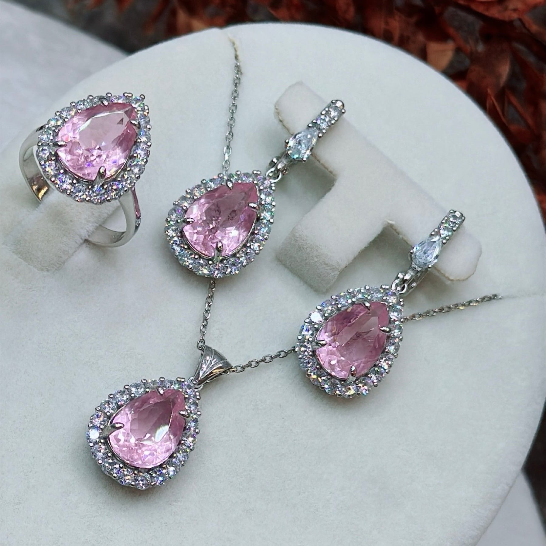 *Pembe Kuvars Damla ve Zirkon Taşlı Özel Üretim