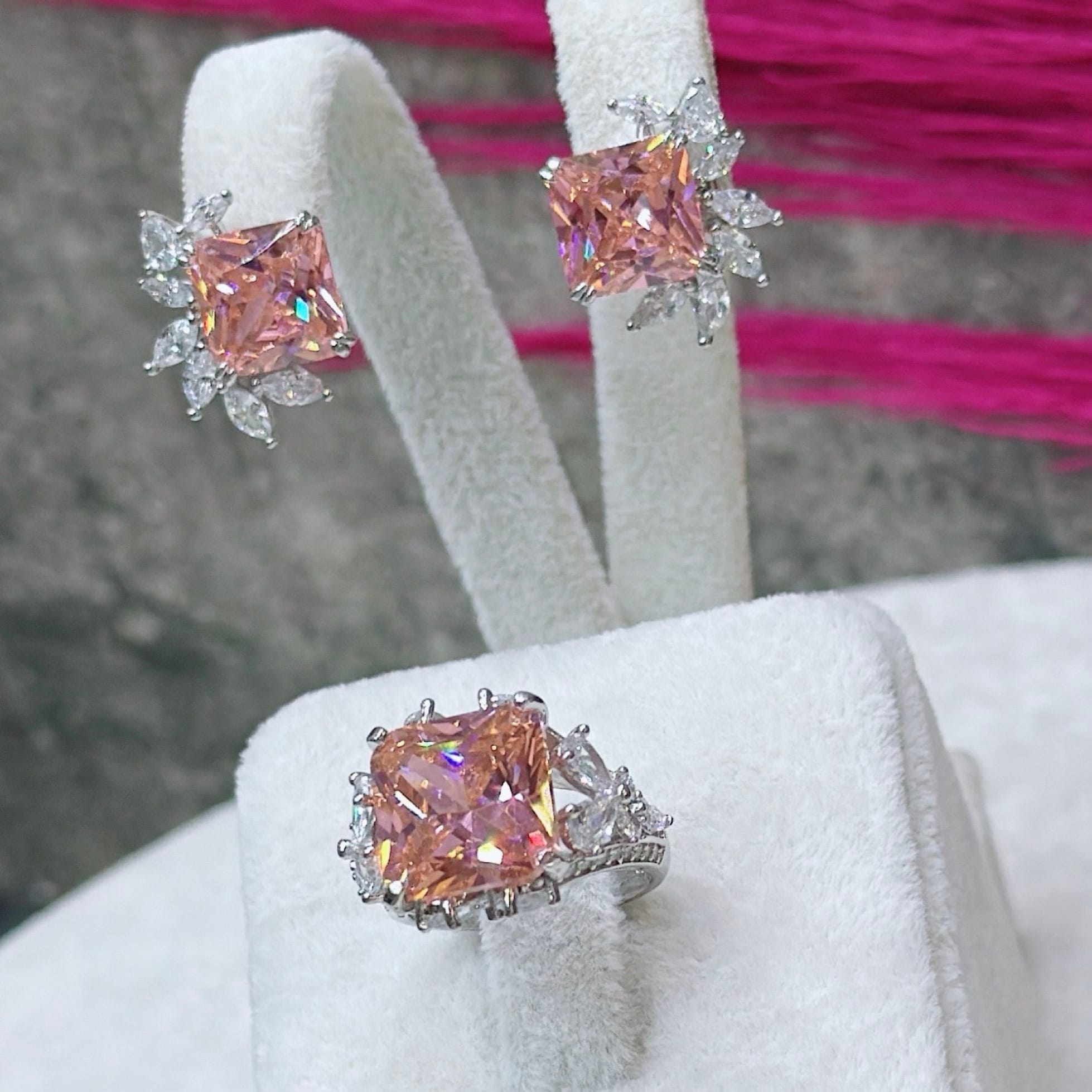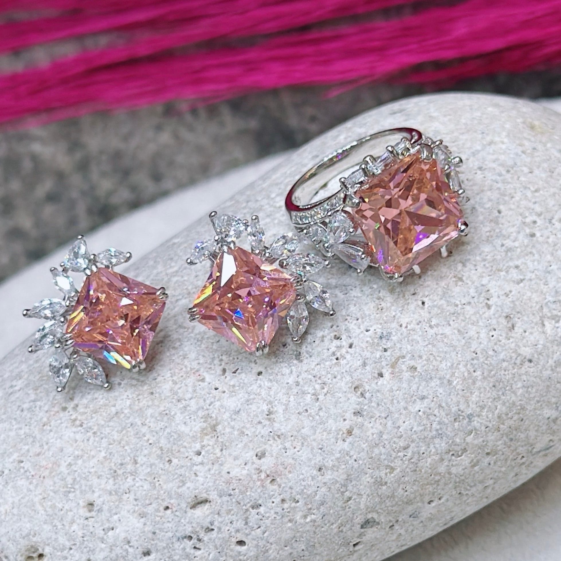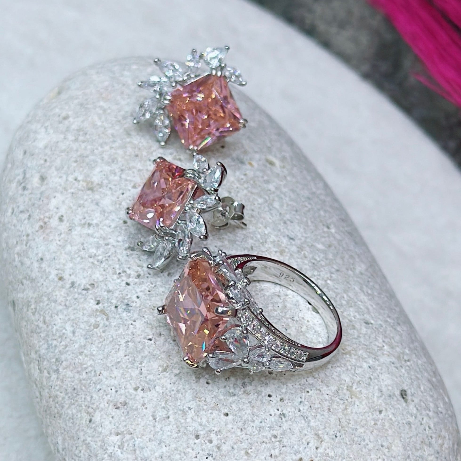 Pembe Kuvars Taşlı Yüzük & Küpe Takım