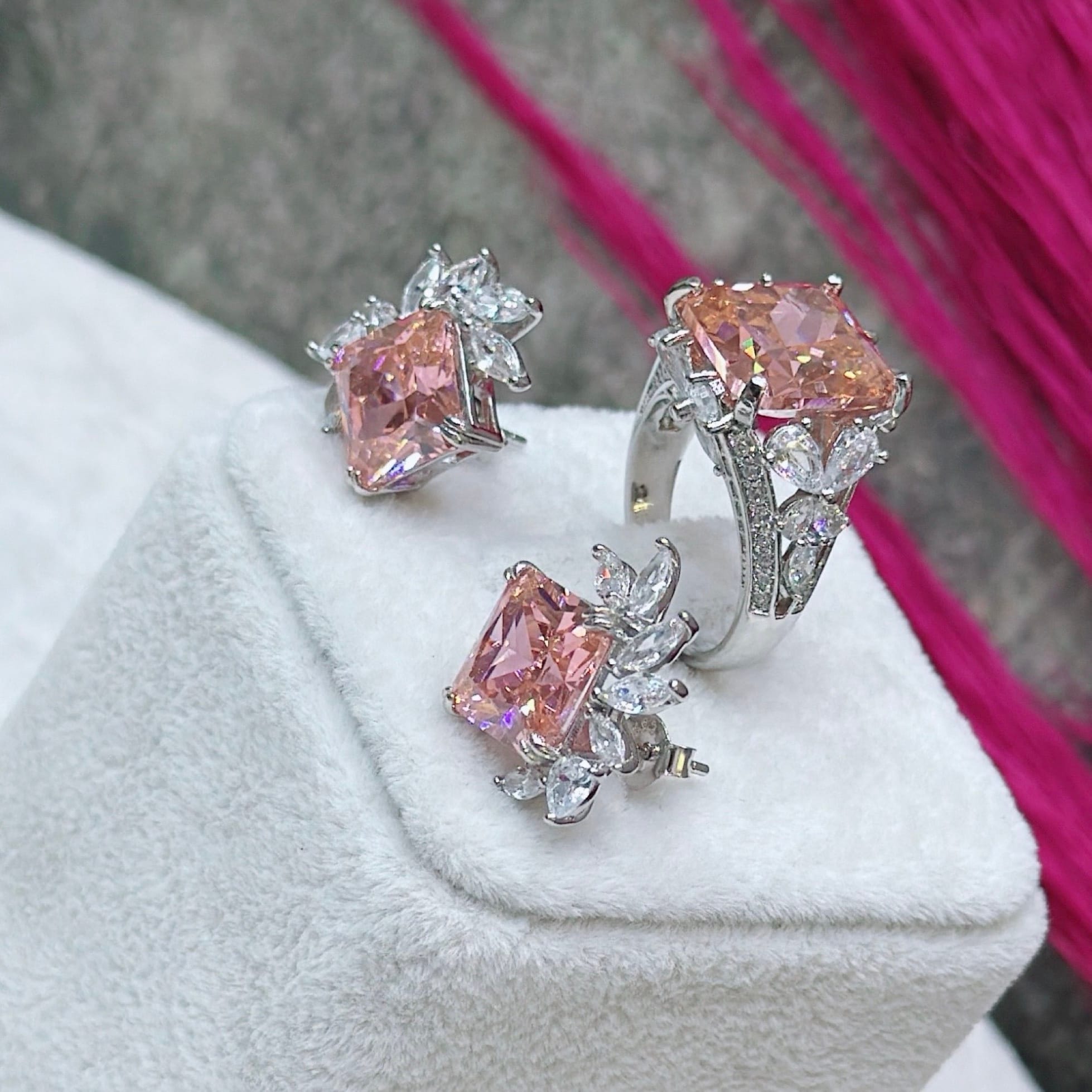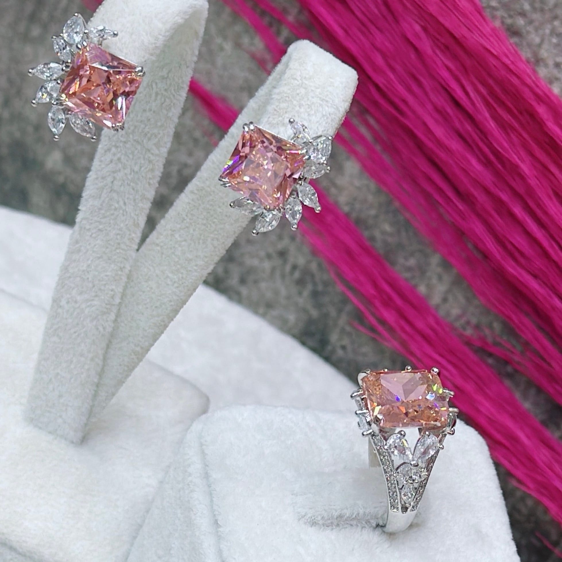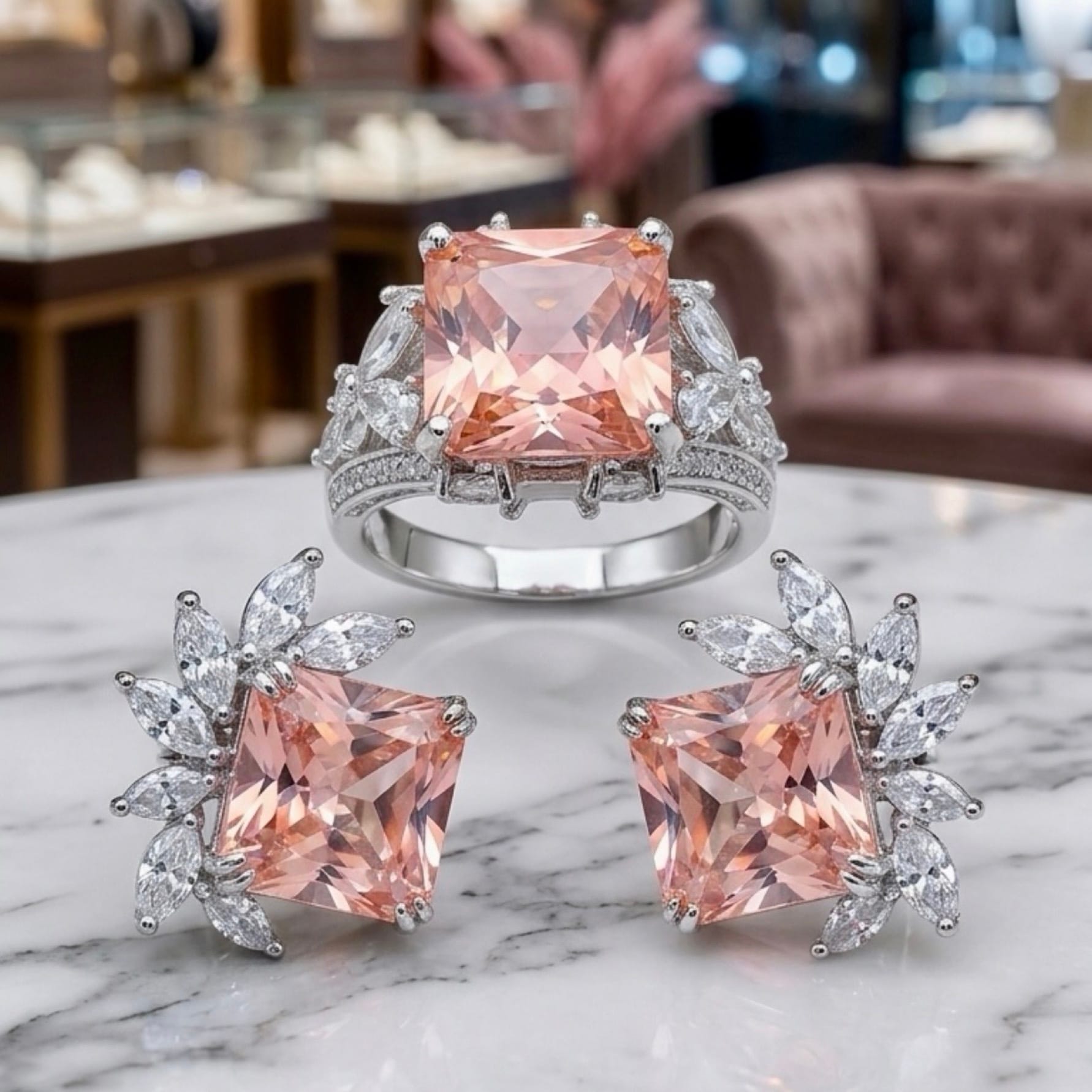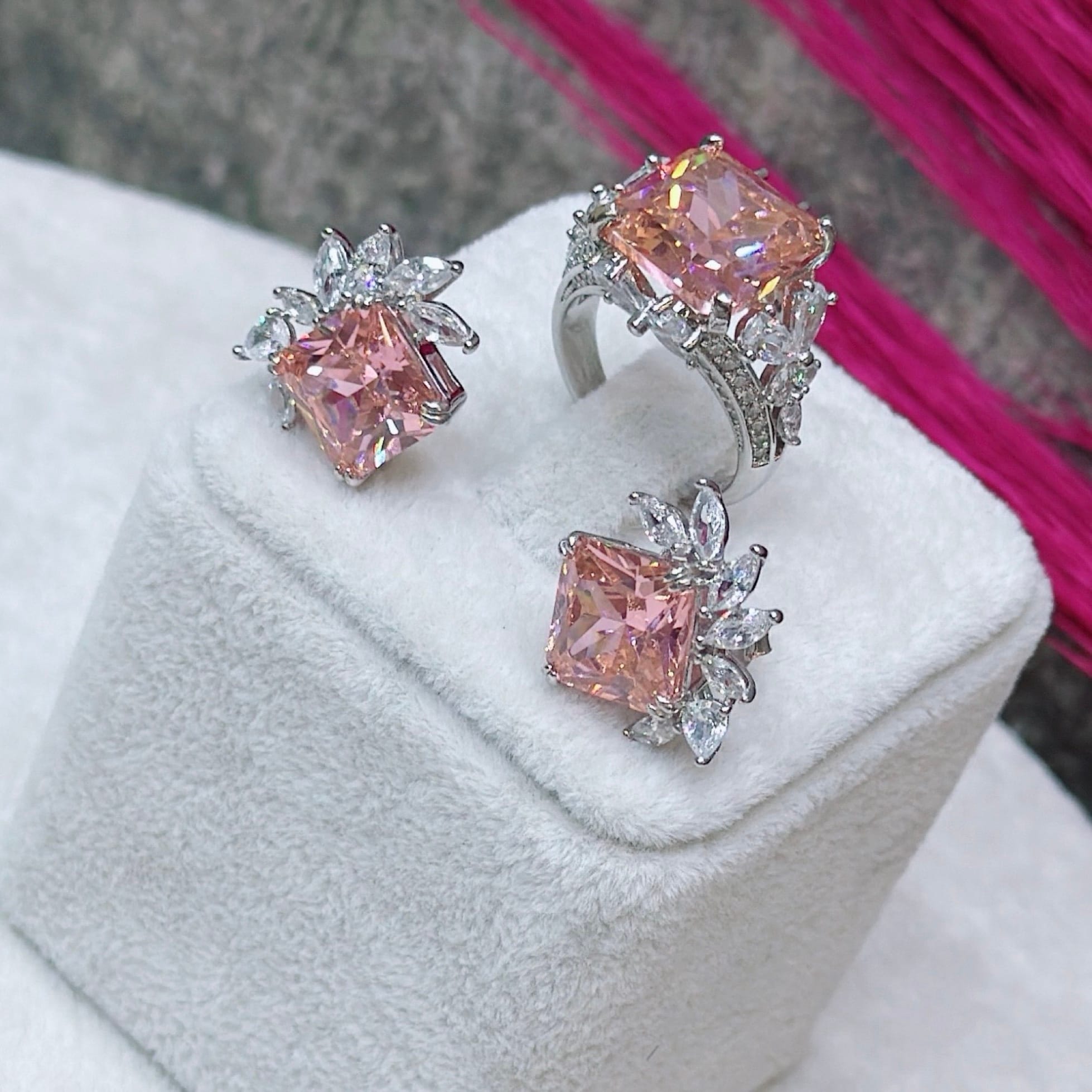 Pembe Kuvars Taşlı Yüzük & Küpe Takım