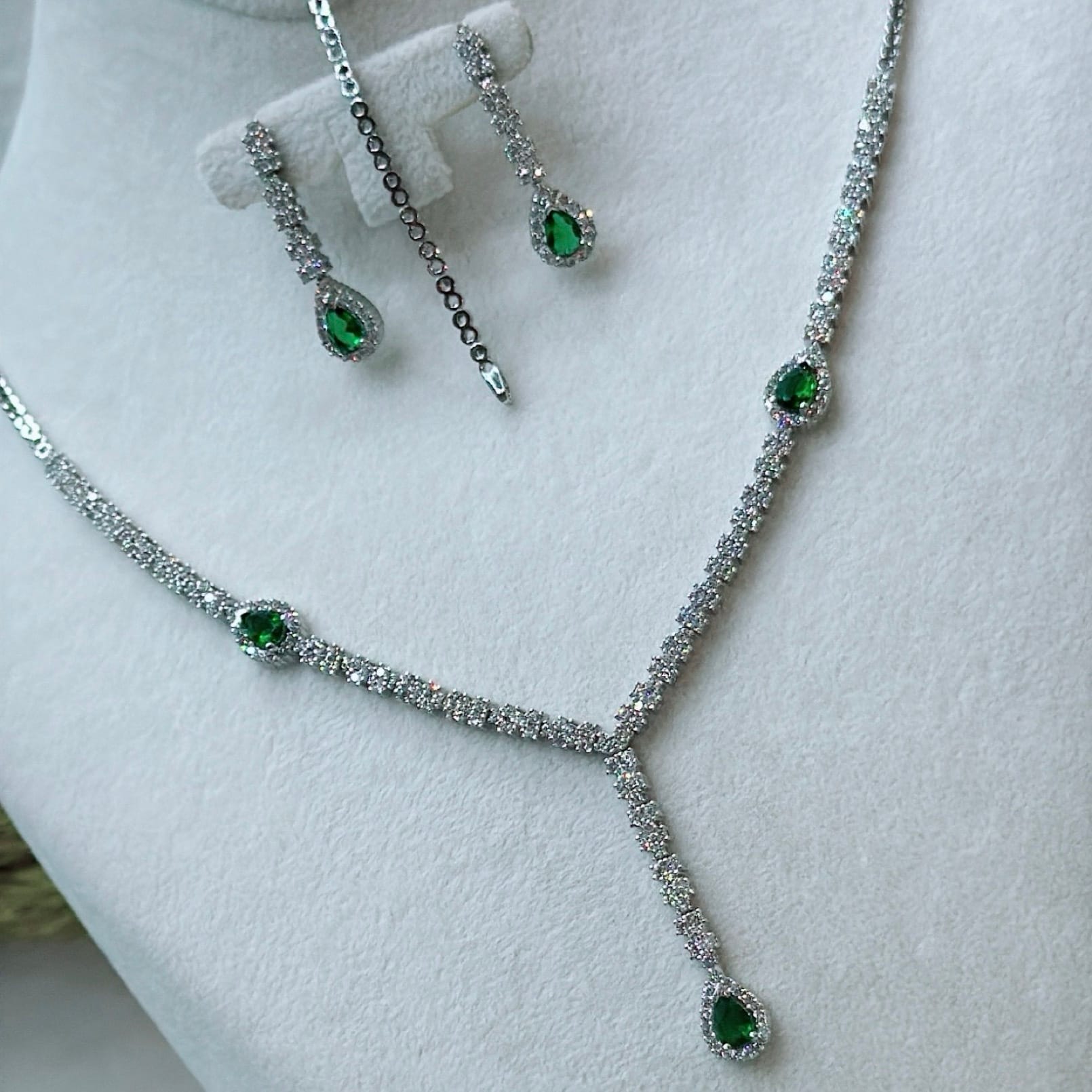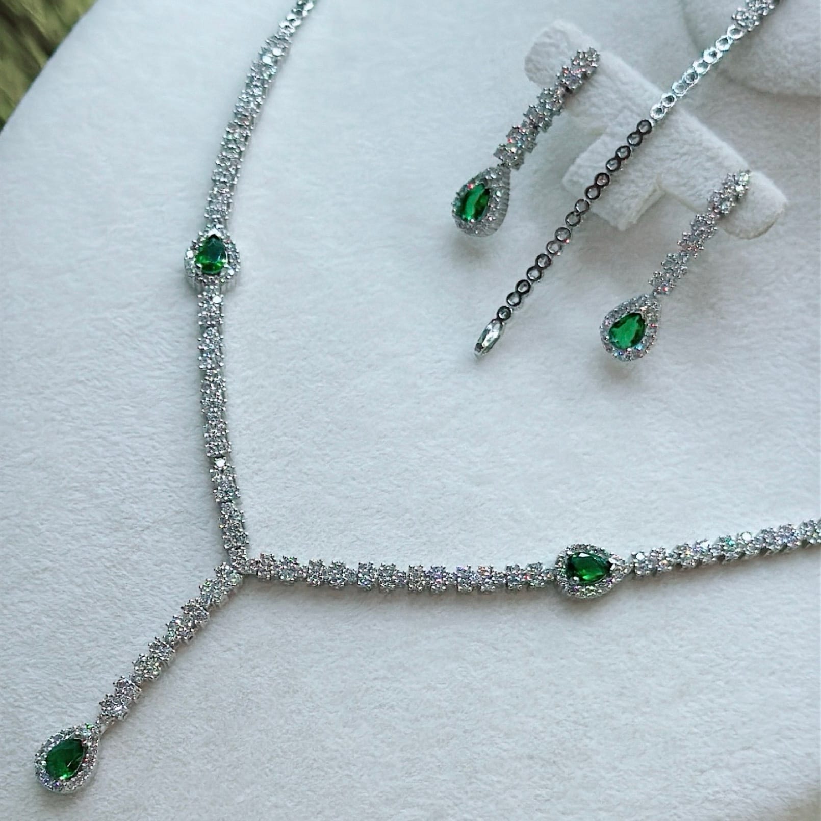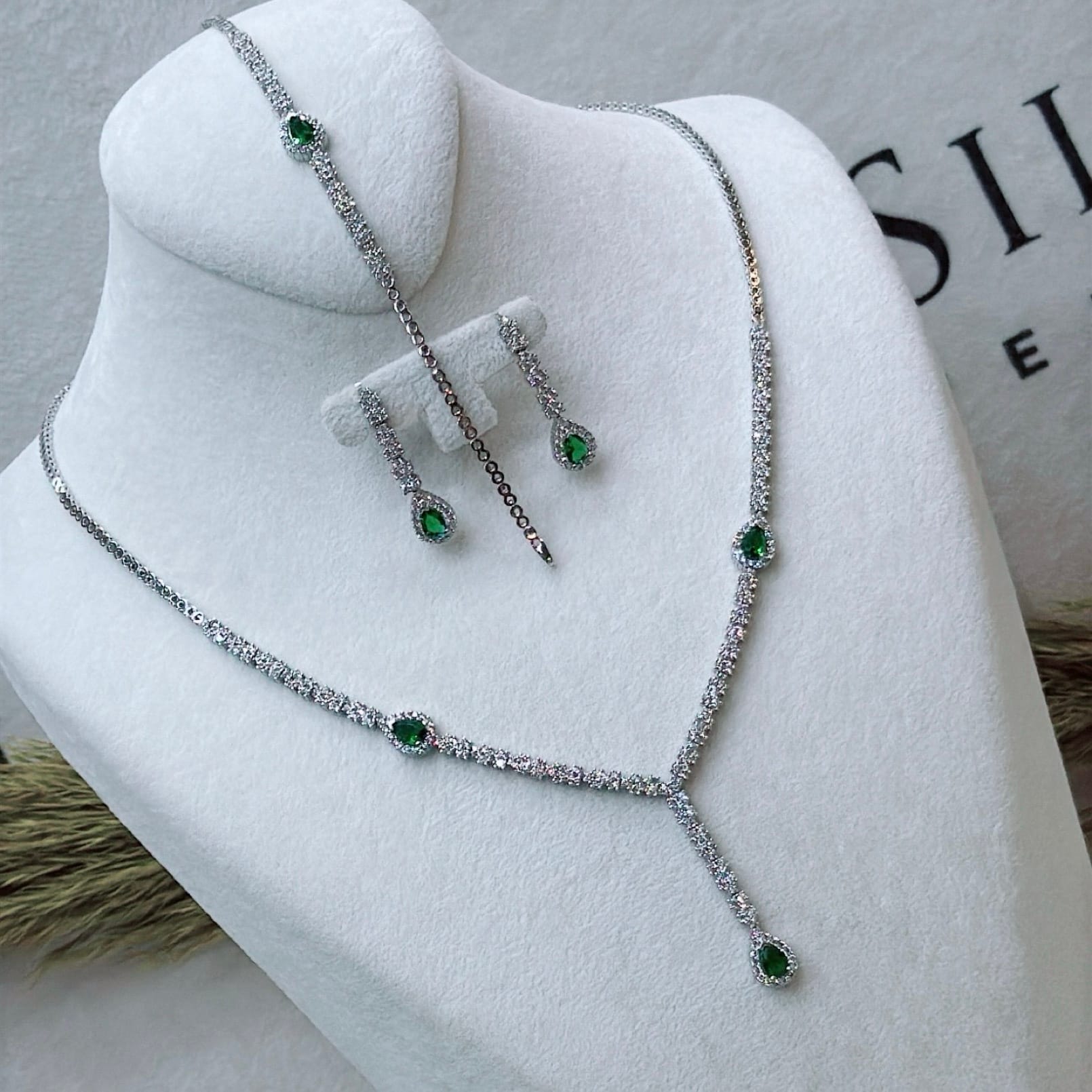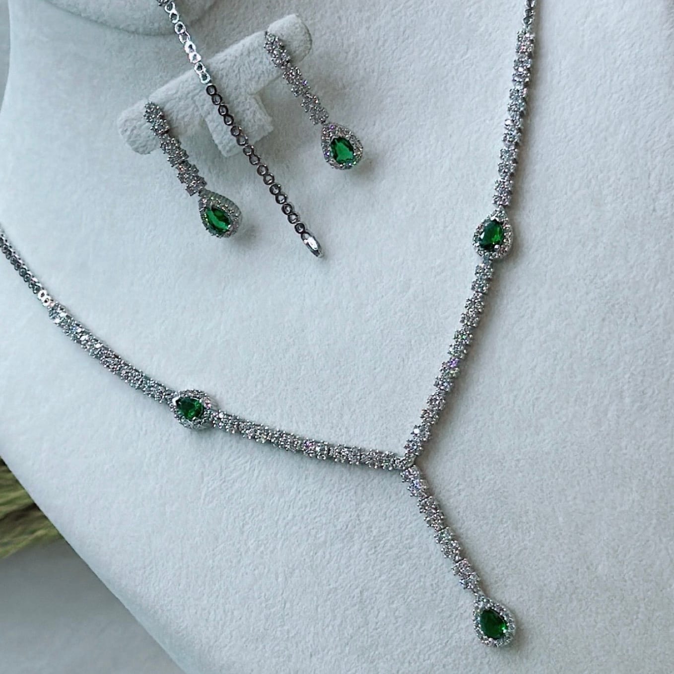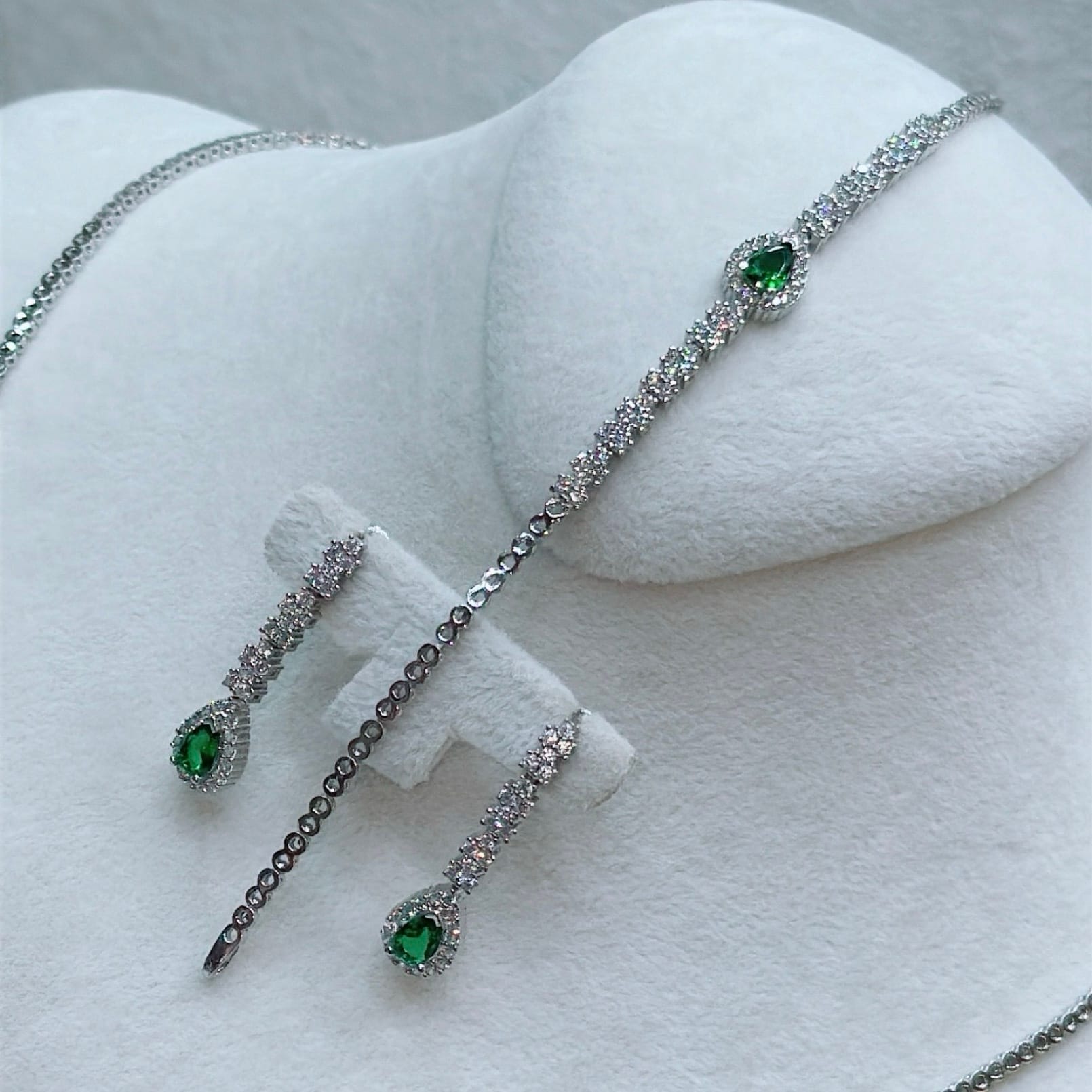 *Zirkon Taşlı Pırlanta & Zümrüt Model Gümüş Set Takım (Gerdanlık-Bileklik-Küpe)