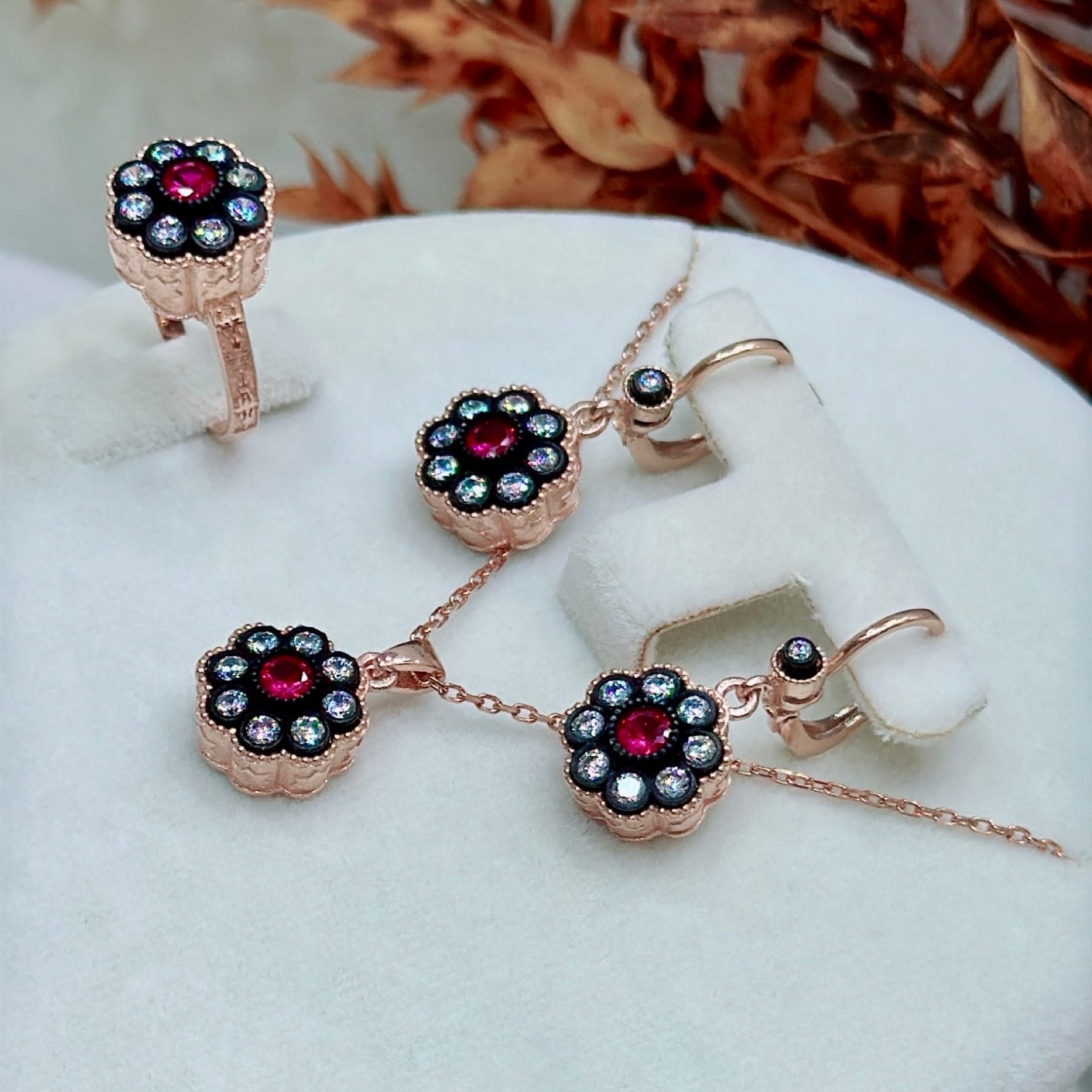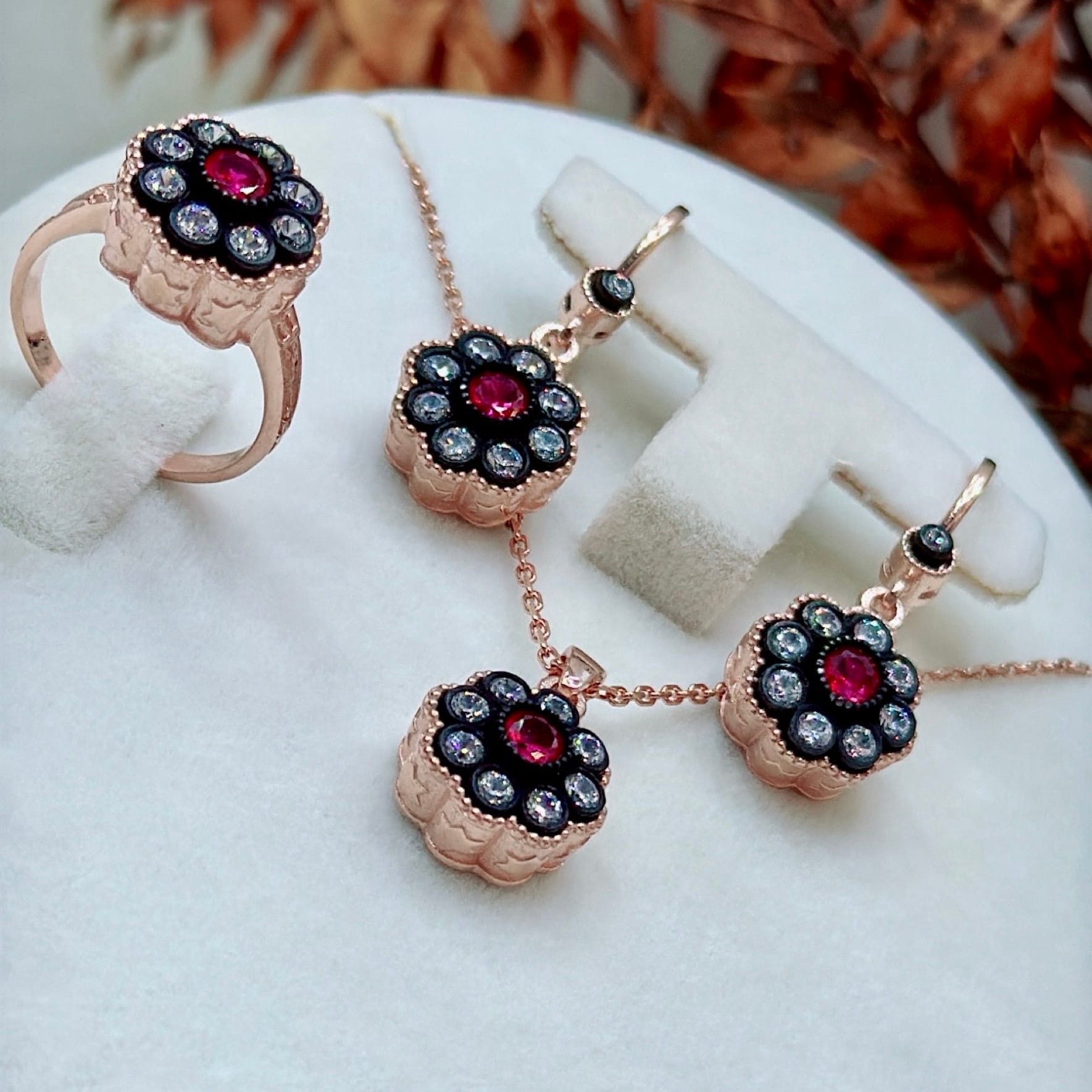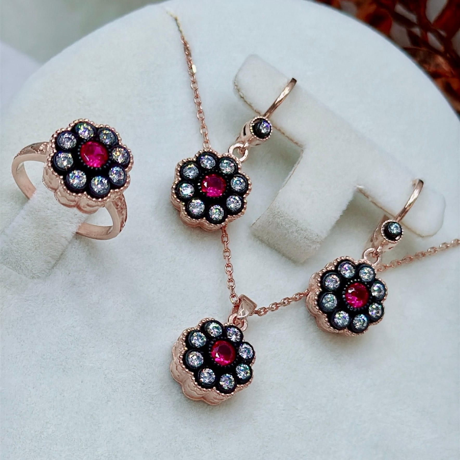 Yakut Renk Taşlı Çiçek Model Üçlü Set