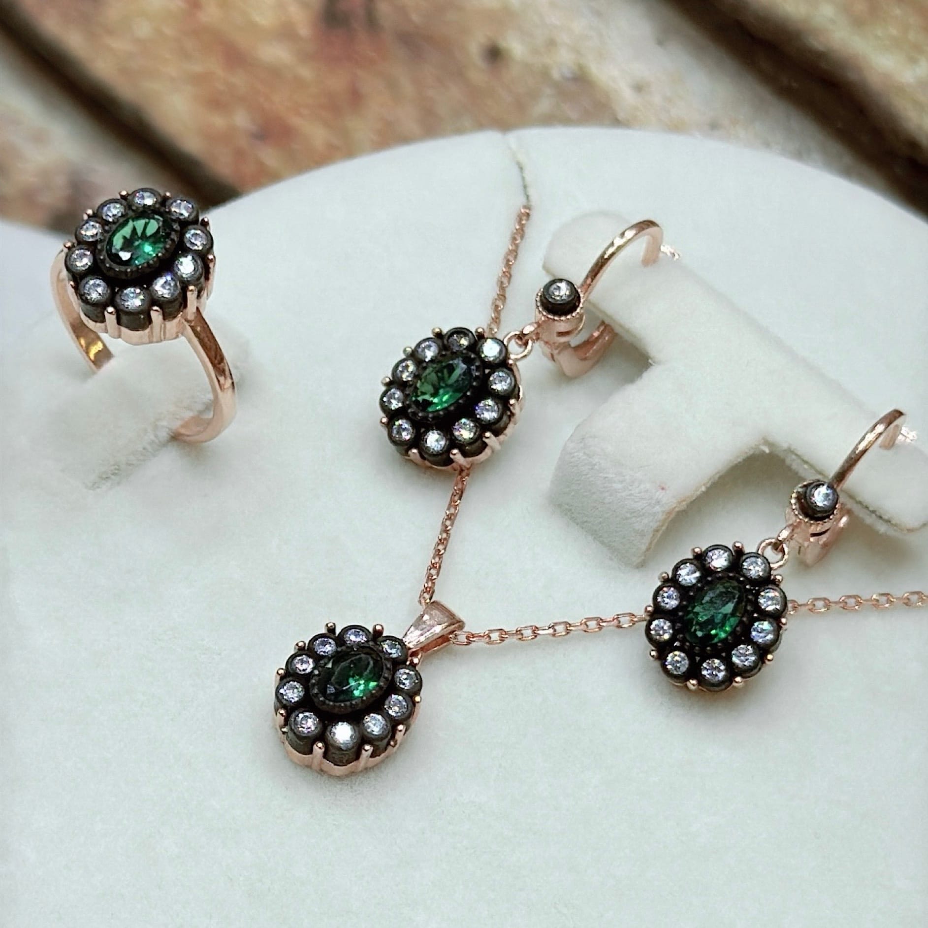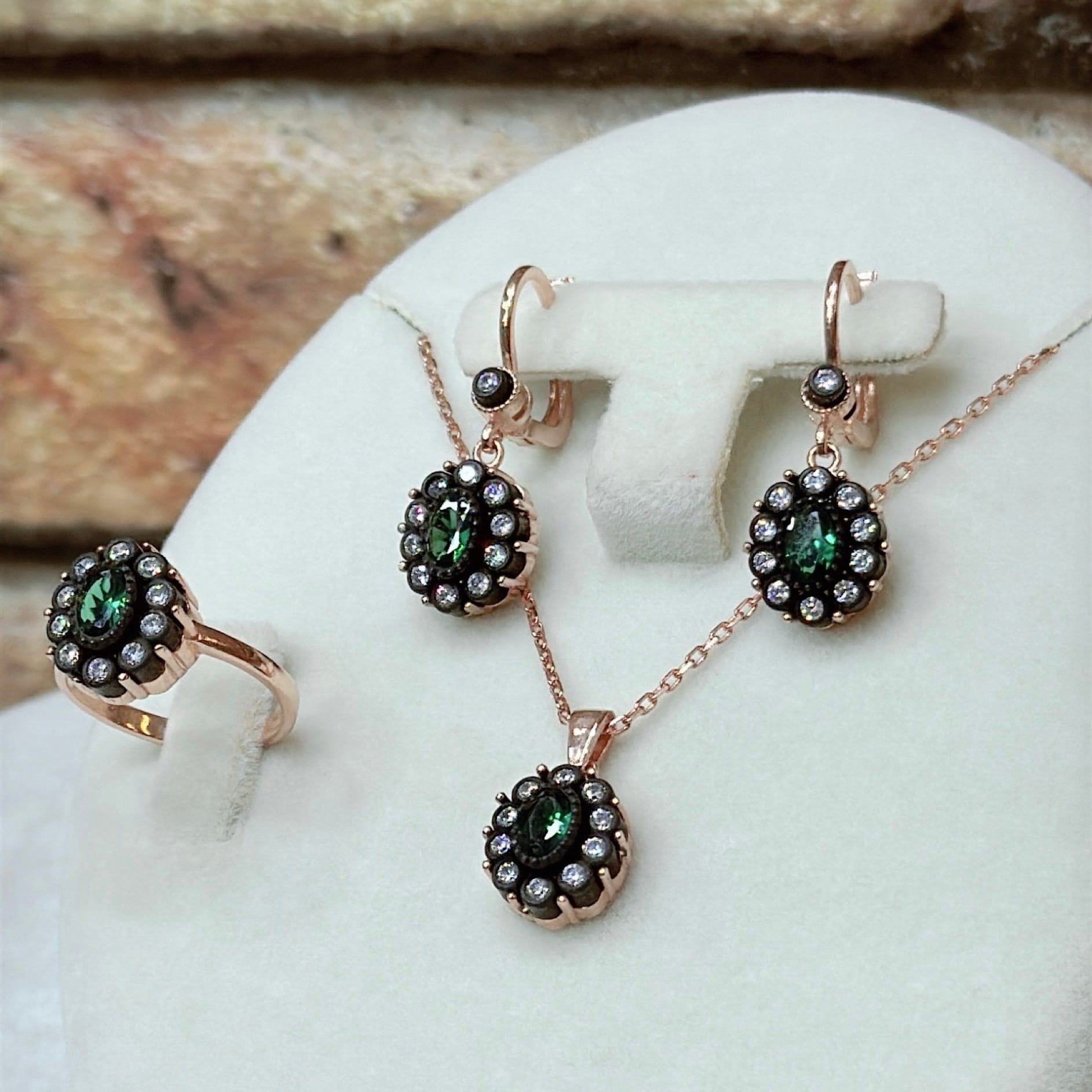 Zümrüt Yeşili Elmas Montür Gümüş Üçlü Set